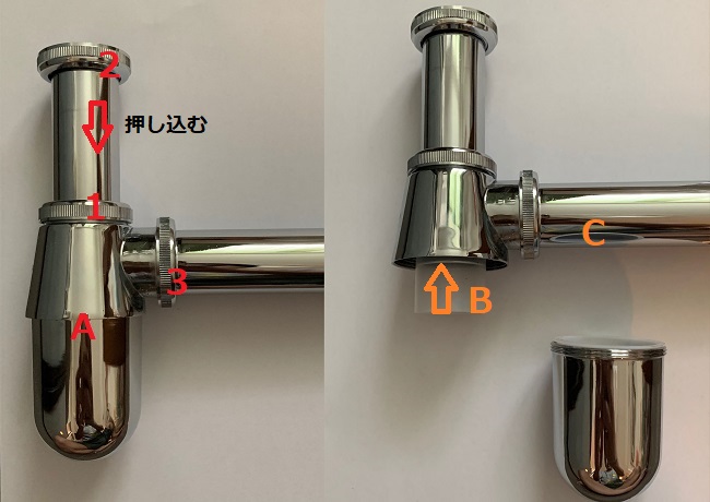 - 取り替える時には、Cの排水管は極力取り外さないほうが無難(壁の中の管との接続が雑な工事もあり、取り替えできない可能性あり)。